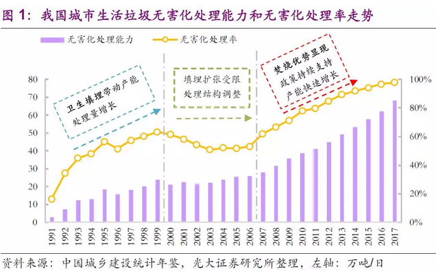 衛(wèi)生填埋技術(shù)在固廢行業(yè)發(fā)展初期帶動(dòng)無害化處理能力的提升。我國(guó)固廢行業(yè)的發(fā)展是伴隨著城鎮(zhèn)化率提升、個(gè)人消費(fèi)的需求而起的。行業(yè)發(fā)展初期(2000年前),無害化處理技術(shù)相對(duì)落后,投資有限,衛(wèi)生填埋技術(shù)憑借其適用范圍廣、技術(shù)簡(jiǎn)單、單位投資和處理成本相對(duì)較低的優(yōu)勢(shì),在這個(gè)時(shí)期引領(lǐng)了行業(yè)的發(fā)展。