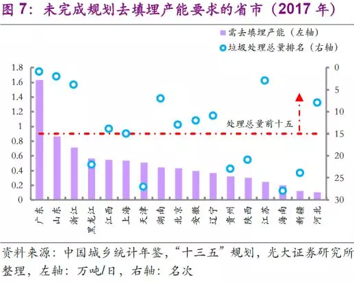 去填埋產(chǎn)能任務(wù)在產(chǎn)廢大省進(jìn)展受阻。“十三五”規(guī)劃中同時(shí)有著去填埋產(chǎn)能的要求。由于我國(guó)垃圾產(chǎn)生量持續(xù)增長(zhǎng),在焚燒產(chǎn)能仍處于爬坡期時(shí),為了完成無害化處置的要求,全國(guó)衛(wèi)生填埋處理能力從2015年的50.15萬噸/日進(jìn)一步增長(zhǎng)至2017年的52.59萬噸/日,距規(guī)劃要求的47.71萬噸/日仍有不少差距。去填埋產(chǎn)能任務(wù)較重的多為產(chǎn)廢大?。◤V東、山東、浙江等),且其去填埋產(chǎn)能缺口和垃圾焚燒產(chǎn)能提升缺口呈現(xiàn)一定的相關(guān)性。