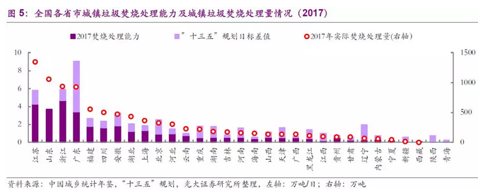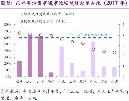 設(shè)市城市生活垃圾焚燒處理能力方面,除了全國(guó)設(shè)市城市垃圾焚燒處置能力比例達(dá)50%的要求之外,規(guī)劃中要求東部省市的設(shè)市城市垃圾焚燒處置占比需達(dá)60%以上。東部十省市中,截止2017年僅有福建、浙江、江蘇、海南等四省滿足上述要求,山東、廣東等產(chǎn)廢大省以及北京、上海等直轄市仍需進(jìn)一步提升其垃圾焚燒處理能力占比。
