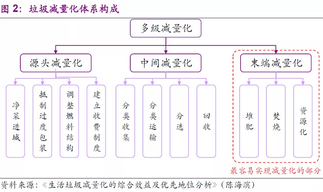 “全過程多級(jí)減量”是最適合我國(guó)可持續(xù)發(fā)展基本思想的垃圾減量化體現(xiàn)形式?!叭^程多級(jí)減量”通過從垃圾體系的源頭、中間、末端等三方面的全面控制用以實(shí)現(xiàn)減少固體廢物產(chǎn)生這一核心要素,而其中最容易優(yōu)先實(shí)現(xiàn)減量化的部分是末端的減量化。