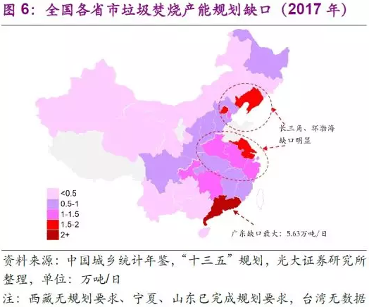 城鎮(zhèn)生活垃圾焚燒處理能力方面,根據(jù)《“十三五”全國(guó)城鎮(zhèn)生活垃圾無害化處理設(shè)施建設(shè)規(guī)劃》的要求,截止2017年,幾乎所有省市(除西藏、青海外)均存在一定的城鎮(zhèn)垃圾焚燒處理產(chǎn)能缺口。產(chǎn)廢大省之一廣東的城鎮(zhèn)垃圾焚燒產(chǎn)能缺口最大(5.63萬噸/日),江蘇、浙江、安徽、天津、北京等長(zhǎng)三角和環(huán)渤海地區(qū)的省市在已有產(chǎn)能較多的同時(shí)也存在較大的產(chǎn)能缺口。