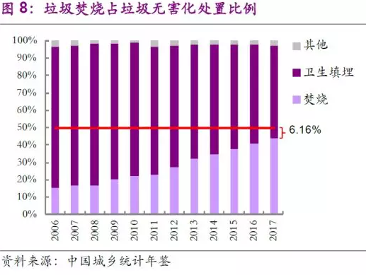 我國(guó)垃圾焚燒行業(yè)從“十二五”期間起快速發(fā)展,全國(guó)城鎮(zhèn)(設(shè)市+縣城)生活垃圾焚燒處理能力從2010年的8.9萬噸/日增長(zhǎng)到2015年的23.5萬噸/日,再到2017年的33.14萬噸/日,每年的設(shè)市城市生活垃圾焚燒處置能力占無害化處理能力比例也從2010年的21.91%提升到2017年的43.84%,但是上述兩個(gè)指標(biāo)與“十三五”規(guī)劃的要求均存在一定差距(“十三五”規(guī)劃要求2020年需完成的指標(biāo)分別為59.14萬噸/日和50%),所以未來兩年仍需完成不小的垃圾焚燒處理設(shè)施建設(shè)任務(wù)。