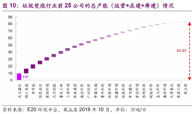 雖然目前運(yùn)營(yíng)產(chǎn)能缺口仍存,但是儲(chǔ)備產(chǎn)能較為充足。根據(jù)E20環(huán)境平臺(tái)的統(tǒng)計(jì),截止2018年10月,行業(yè)排名前25的公司的垃圾焚燒處理總產(chǎn)能(含運(yùn)營(yíng)+在建+籌建)已達(dá)82.85萬噸/日,超規(guī)劃要求的59.14萬噸/日。