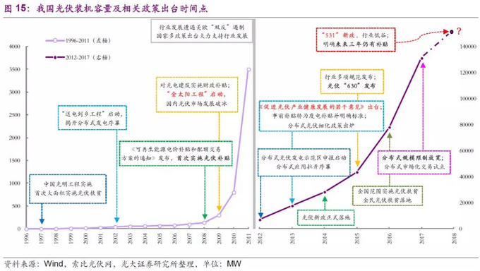 和新能源汽車行業(yè)類似,我國(guó)光伏行業(yè)的高速發(fā)展同樣離不開政府政策的大力支持和財(cái)政補(bǔ)貼的持續(xù)幫助。我國(guó)光伏裝機(jī)容量的高增速起點(diǎn)便是2008年《2008年7月~12月可再生能源電價(jià)補(bǔ)貼和配額交易方案的通知》的發(fā)布,首次實(shí)施光伏補(bǔ)貼。2012年我國(guó)遭遇美歐“雙反”政策后,國(guó)家持續(xù)出臺(tái)多項(xiàng)政策和補(bǔ)貼細(xì)則支持光伏行業(yè)的發(fā)展,帶動(dòng)我國(guó)新增光伏裝機(jī)容量自2013年起連續(xù)五年位居全球第一,2017年光伏裝機(jī)容量已達(dá)131GW(全球第一)。