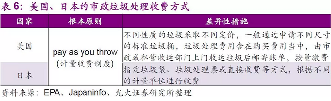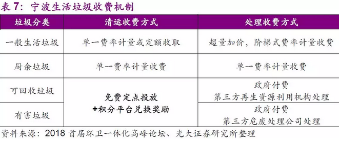 但是隨著垃圾分類和垃圾清運(yùn)市場(chǎng)化進(jìn)程的逐步完善,我們認(rèn)為未來中國(guó)有可能參照以上發(fā)達(dá)國(guó)家的收費(fèi)模式。在2017年12月20日住建部發(fā)《關(guān)于加快推進(jìn)部分重點(diǎn)城市生活垃圾分類工作的通知》(以下簡(jiǎn)稱“通知”)中,明確提出要“完善生活垃圾收費(fèi)政策,逐步建立差別化的收費(fèi)制度,實(shí)現(xiàn)按量收費(fèi)?!睆V州市作為第一個(gè)“吃螃蟹”的中國(guó)內(nèi)地城市,《廣州市生活垃圾分類管理?xiàng)l例(草案)》已提請(qǐng)市人大審議,其中首次提出了按照“多產(chǎn)生多收費(fèi)”等多項(xiàng)原則進(jìn)行收費(fèi)。2018年7月2日,發(fā)改委發(fā)布《關(guān)于創(chuàng)新和完善促進(jìn)綠色發(fā)展價(jià)格機(jī)制的意見》,提出到2020年底前,全國(guó)城市及建制鎮(zhèn)全面建立生活垃圾處理收費(fèi)制度,標(biāo)志著垃圾分類即將進(jìn)入收費(fèi)時(shí)代。