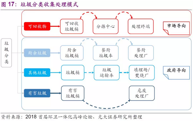 (3)收集精細(xì)化,推動(dòng)再生資源行業(yè)的發(fā)展。再生資源回收利用行業(yè)原本也是政府大力推進(jìn)的固廢處理板塊,是實(shí)現(xiàn)垃圾處理“資源化”目標(biāo)的最有效手段。但是行業(yè)發(fā)展受阻的重要原因之一便是垃圾分類制度的不健全,導(dǎo)致拾荒者、黑市等現(xiàn)象頻出,行業(yè)劣質(zhì)公司騙補(bǔ)情況嚴(yán)重,導(dǎo)致行業(yè)發(fā)展緩慢。垃圾分類的全面實(shí)施可以提高前端垃圾收集的精細(xì)化程度,更能進(jìn)一步推進(jìn)再生資源和生活垃圾網(wǎng)絡(luò)的“兩網(wǎng)融合”,推動(dòng)再生資源行業(yè)的發(fā)展。