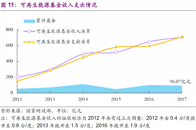 未入庫項(xiàng)目的一次性入庫補(bǔ)足需求同樣可以被較好消化。截止至第七批可再生能源電價(jià)附加資金補(bǔ)助目錄發(fā)布,共有189個(gè)垃圾焚燒項(xiàng)目納入補(bǔ)助目錄,垃圾焚燒產(chǎn)能為17.01萬噸/日,僅占2017年全部產(chǎn)能(33.14萬噸/日)的51.33%。垃圾焚燒項(xiàng)目入庫率相對(duì)較低的主要原因是第七批補(bǔ)助目錄的納入要求為發(fā)電項(xiàng)目需在2016年3月前并網(wǎng),在2016年3月-2017年新上網(wǎng)的垃圾焚燒項(xiàng)目不滿足申請(qǐng)要求,而該段時(shí)期垃圾焚燒產(chǎn)能保持了高增速。根據(jù)城鄉(xiāng)統(tǒng)計(jì)年鑒數(shù)據(jù),約4萬噸/天的城鎮(zhèn)垃圾焚燒產(chǎn)能(共1365萬噸焚燒垃圾處理量)暫時(shí)無法被納入補(bǔ)貼目錄。根據(jù)一般政府補(bǔ)助基金要求,假設(shè)上述項(xiàng)目在第八批(假設(shè)時(shí)間為2020年)被納入補(bǔ)貼目錄,需一次補(bǔ)足的金額(假設(shè)從2016年3月起并網(wǎng)至2020年)約為30億元。而可再生能源基金截止2017年的收入盈余為90.07億元,完全可以覆蓋該一次性支出。