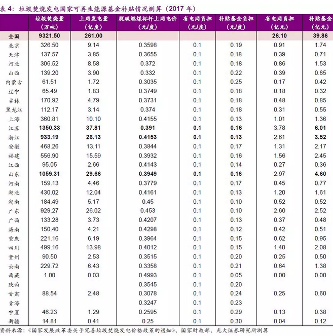 根據(jù)全國(guó)城鄉(xiāng)統(tǒng)計(jì)年鑒的數(shù)據(jù),2017年全國(guó)城鎮(zhèn)垃圾焚燒處理量達(dá)9321.50萬噸。根據(jù)《國(guó)家發(fā)展改革委關(guān)于完善垃圾焚燒發(fā)電價(jià)格政策的通知》的補(bǔ)貼要求,每噸入廠生活垃圾折算上網(wǎng)電量假定為280度,計(jì)算得出全國(guó)垃圾焚燒上網(wǎng)發(fā)電量為261億度。進(jìn)一步根據(jù)各省市脫硫燃煤標(biāo)桿上網(wǎng)電價(jià),以及分?jǐn)傊贫纫?,假設(shè)全國(guó)所有垃圾焚燒項(xiàng)目均滿足國(guó)補(bǔ)要求并納入可再生能源基金補(bǔ)貼目錄(實(shí)際的入庫率約為51%),測(cè)算得出2017年垃圾焚燒行業(yè)需要的國(guó)家可再生能源基金補(bǔ)貼總額為39.86億元(各省電網(wǎng)負(fù)擔(dān)26.10億元),僅占2017年可再生能源基金實(shí)際支出(712.06億元)的5.60%。