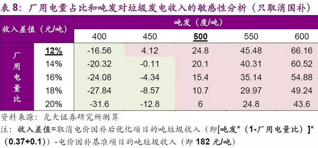 在此情景下,當(dāng)優(yōu)化項(xiàng)目的噸發(fā)達(dá)到500度/噸,或是廠用電量占比低于12%時(shí),便基本可以保證優(yōu)化項(xiàng)目的垃圾焚燒發(fā)電收入可以覆蓋基準(zhǔn)項(xiàng)目電價(jià)補(bǔ)貼帶來的額外收入,優(yōu)化項(xiàng)目在無國(guó)補(bǔ)情況下仍然可以給公司帶來穩(wěn)定收益。