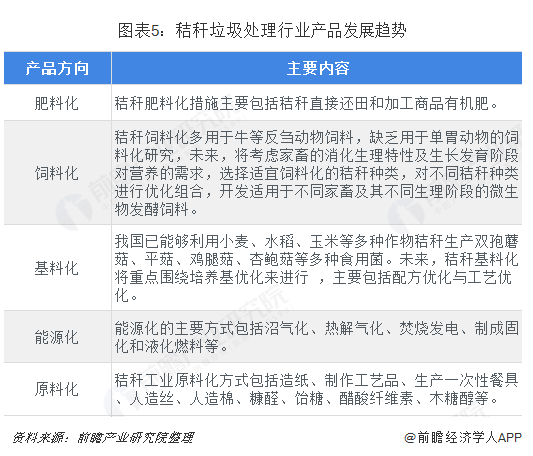 其次,在產品趨勢方面,秸稈綜合利用行業(yè)產品仍將圍繞“五化”展開,即秸稈肥料化、秸稈飼料化、秸稈能源化、秸稈原料化以及秸稈基料化。