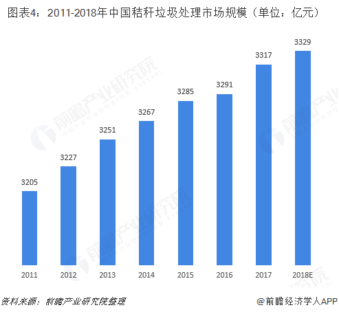 市場規(guī)模來看,2017年,我國秸稈垃圾處理行業(yè)市場規(guī)模已達到3317億元,相比2011年的3205億元增長了3.5%;預計2018年,秸稈垃圾處理行業(yè)市場規(guī)模在3329億元左右。隨著我國秸稈垃圾處理的利用率的不斷提升及技術水平的不斷進步,未來秸稈垃圾處理行業(yè)的市場規(guī)模有望繼續(xù)保持緩慢上升態(tài)勢。
