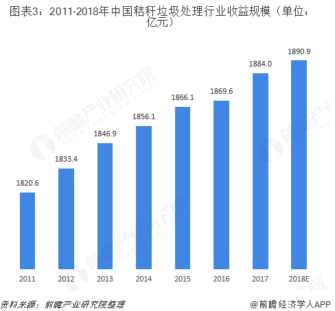 結合上述收益水平以及國家政府的大力補貼,2017年,秸稈垃圾處理行業(yè)收益規(guī)模達到1884.0億元,同比增長0.8%,行業(yè)收益率達到56.8%;預計到2018年,行業(yè)收益規(guī)模有望繼續(xù)增長至1890.9億元。