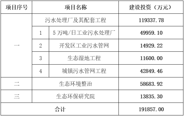 據(jù)悉,江蘇省泰興經(jīng)濟(jì)開發(fā)區(qū)污水處理及生態(tài)環(huán)境提升PPP項(xiàng)目總投資約為204882.38萬元,其中建設(shè)投資191857.00萬元。根據(jù)本項(xiàng)目各子項(xiàng)的工程可行性研究報(bào)告,本項(xiàng)目的建設(shè)投資構(gòu)成詳見下表,最終總投資以建設(shè)期結(jié)束后經(jīng)審計(jì)的竣工決算額為準(zhǔn)。