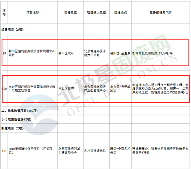 導(dǎo)讀:2019年,北京圍繞首都經(jīng)濟(jì)社會發(fā)展關(guān)鍵領(lǐng)域和薄弱環(huán)節(jié),謀劃實(shí)施“三個一百”市政府重點(diǎn)工程,包括100個基礎(chǔ)設(shè)施、100個民生改善和100個高精尖產(chǎn)業(yè)項目。涉及多個環(huán)保項目,其中垃圾處理設(shè)施項目3個,重點(diǎn)實(shí)施豐臺區(qū)循環(huán)經(jīng)濟(jì)產(chǎn)業(yè)園滲瀝液處理廠二期工程、朝陽區(qū)建筑垃圾資源化處置項目等。
