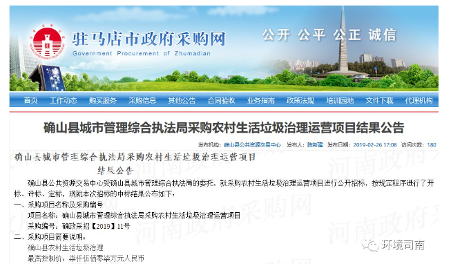 確山縣農(nóng)村生活垃圾治理運(yùn)營項目中標(biāo)信息