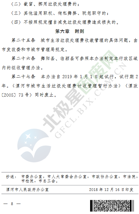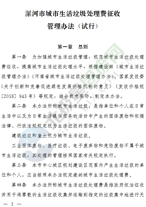 日前,《漯河市城市生活垃圾處理費(fèi)征收管理辦法(試行)》已經(jīng)河南漯河市政府第36次常務(wù)會(huì)議研究通過(guò),并于2019年1月1日起試行?!朵鸷邮谐鞘猩罾幚碣M(fèi)征收管理辦法(試行)》是對(duì)《漯河市城市生活垃圾處理費(fèi)計(jì)收管理暫行辦法》(漯政〔2005〕73號(hào))的完善修訂。