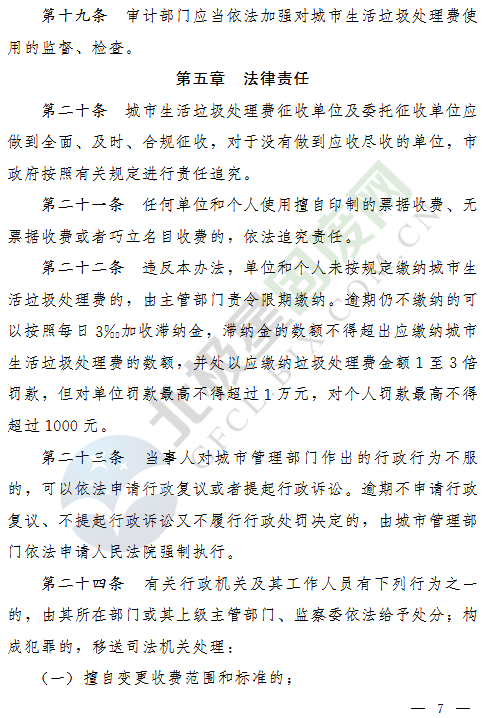 答:違反本辦法,單位和個(gè)人未按規(guī)定繳納城市生活垃圾處理費(fèi)的,由主管部門責(zé)令限期繳納。逾期仍不繳納的可以按照每日千分之三加收滯納金,滯納金的數(shù)額不得超出應(yīng)繳納城市生活垃圾處理費(fèi)的數(shù)額,并處以應(yīng)繳納垃圾處理費(fèi)金額1至3倍罰款,但對(duì)單位罰款最高不得超過(guò)1萬(wàn)元,對(duì)個(gè)人罰款最高不得超過(guò)1000元。