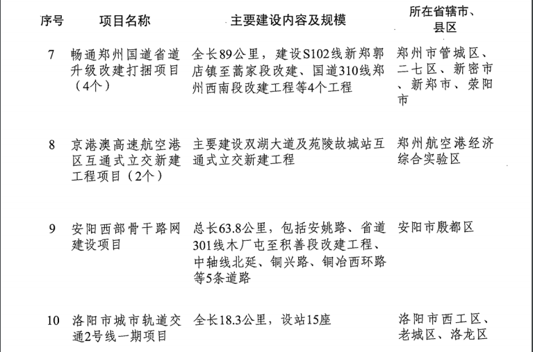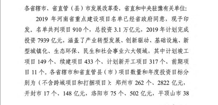 河南省發(fā)改委發(fā)布《關(guān)于印發(fā)2019年河南省重點建設(shè)項目名單的通知》。名單共列項目910個,總投資3.1萬億元,2019年計劃完成投資7939億元,涵蓋了產(chǎn)業(yè)轉(zhuǎn)型發(fā)展、創(chuàng)新驅(qū)動、基礎(chǔ)設(shè)施、新型城鎮(zhèn)化、生態(tài)環(huán)保、民生和社會事業(yè)六大領(lǐng)域18個行業(yè)。其中計劃竣工項目149個、續(xù)建項目433個、計劃新開工項目317個、前期項目11個。