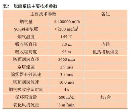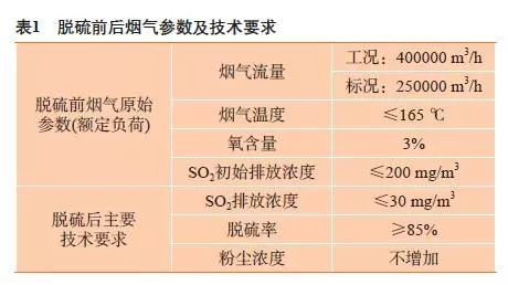 新建的130 T高溫超高壓高爐煤氣鍋爐排放的煙氣含硫最高200 mg/m3,粉塵5 mg/m3。根據(jù)當(dāng)前國家環(huán)保的排放限值是:SO2 30 mg/m3和粉塵5 mg/m3,因此需要對排放煙氣設(shè)計脫硫方案(見表1),使排放煙氣SO2含量降到30 mg/m3以下,同時脫硫過程不得增加粉塵濃度,并且保證脫硫機組年穩(wěn)定運行時間≥8400 h,除霧器出口機械水含量≤75 mg/m3。