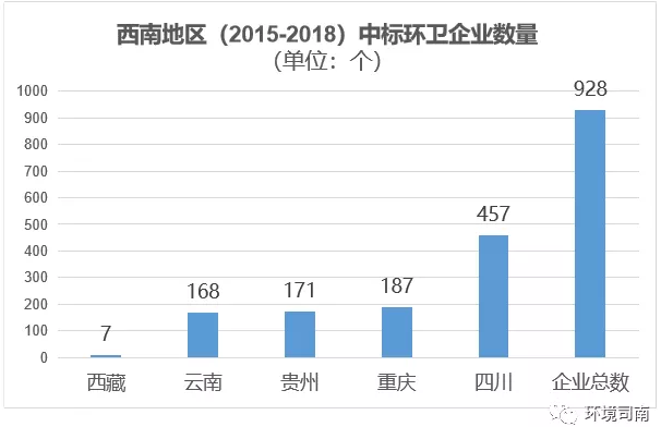 備注:西南地區(qū)(2015-2018)中標(biāo)環(huán)衛(wèi)企業(yè)總數(shù)為928個,五省市區(qū)的中標(biāo)企業(yè)數(shù)量之和大于928的原因在于:有少量規(guī)模較大的環(huán)衛(wèi)企業(yè)是跨省份投標(biāo),出現(xiàn)重復(fù)統(tǒng)計。