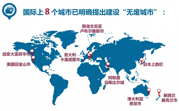 國際上 8 個城市已明確提出建設“無廢城市”(見下圖),其建設成效已獲得國際社會認可。雖然因資源稟賦、政治體制、管理制度、文化習慣等不同,在建設“無廢城市”過程中采取的路徑和措施存在較大差異,但相同的是,這些城市均制定了長期且量化的“無廢”目標,遵循廢棄物避免、減少、重復使用、循環(huán)利用、能量恢復、填埋的處理優(yōu)先級順序,并不斷完善廢棄物管理體系、引入專業(yè)化的管理等。