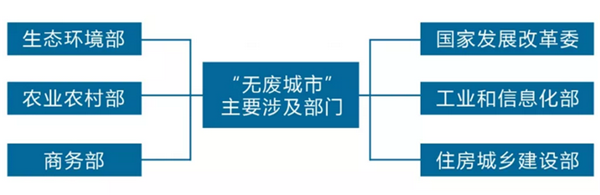 由于“無廢城市”建設試點涉及的技術性強、領域多、范圍廣,因此政府應是“無廢城市”建設重要的責任主體,應當強化頂層設計引領,發(fā)揮政府宏觀指導作用。下圖列示了建設“無廢城市”涉及的主要政府職能部門。