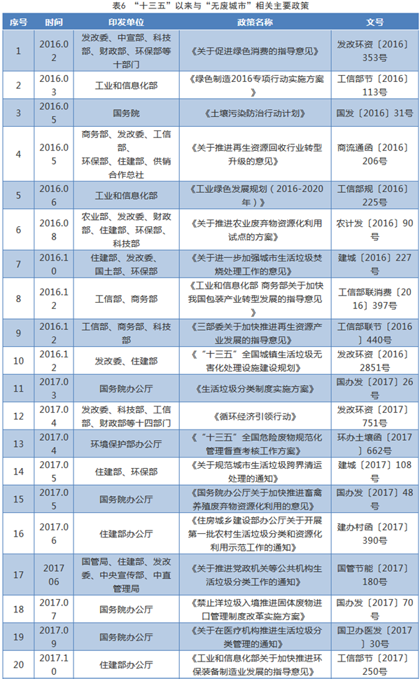 “十三五”以來,國家頻繁出臺相關政策為“無廢城市”的建設進行鋪墊,這些政策對于“無廢城市”建設發(fā)展影響重大、指導意義深遠。