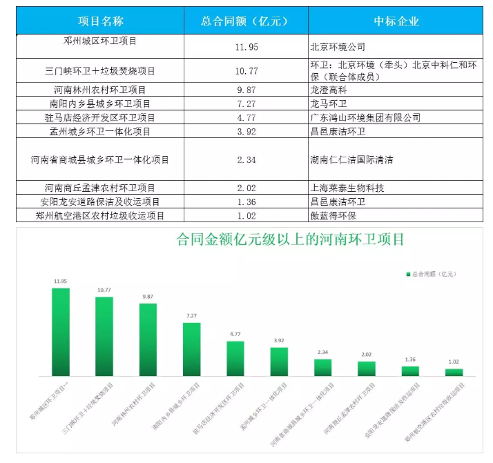 有的企業(yè)專攻大城市重點城區(qū)的一體化項目,比如北京環(huán)衛(wèi)集團、龍馬環(huán)衛(wèi)、龍澄高科、昌邑康潔環(huán)衛(wèi)等,這些項目服務期限長,年服務費和總合同金額也大,少則1-2億元,多則10億元以上。在大項目開拓上,北京環(huán)衛(wèi)集團略勝一籌,旗下的北京環(huán)境公司斬獲鄧州城區(qū)環(huán)衛(wèi)項目和三門峽環(huán)衛(wèi)+垃圾焚燒項目,總合同金額累計達22.72億元,按照本文開端提到釋放60億元的訂單,僅北京環(huán)衛(wèi)集團一家,便占據(jù)河南三分之一的市場。
