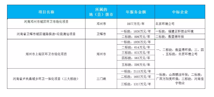 相比這些地區(qū),河南環(huán)衛(wèi)市場服務更加整體、不零散,項目區(qū)域整體打包現(xiàn)象明顯。即便像河南三門峽市、鄧州、衛(wèi)輝等人口大市,也是整體打包給某一個或兩個實力強勁的企業(yè)提供服務。