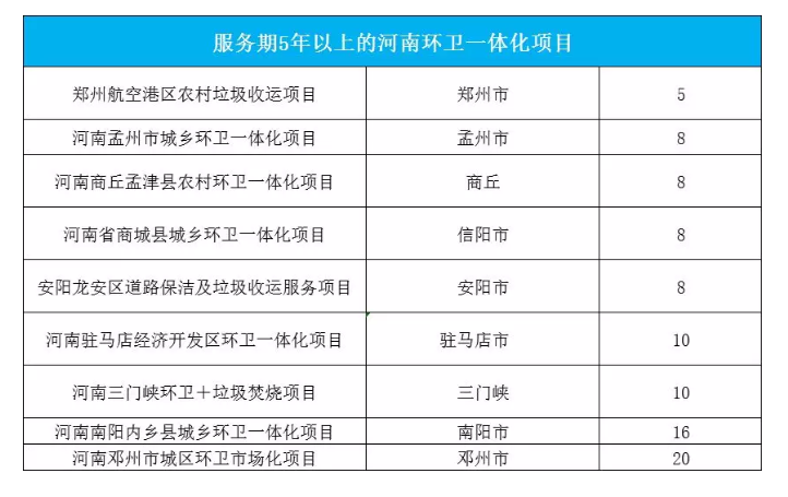 同樣矚目還有林州環(huán)衛(wèi)項目、南陽內(nèi)鄉(xiāng)縣環(huán)衛(wèi)項目、新蔡縣環(huán)衛(wèi)項目,年服務金額千萬級以上,合同期限10年,總合同金額超過5億元。