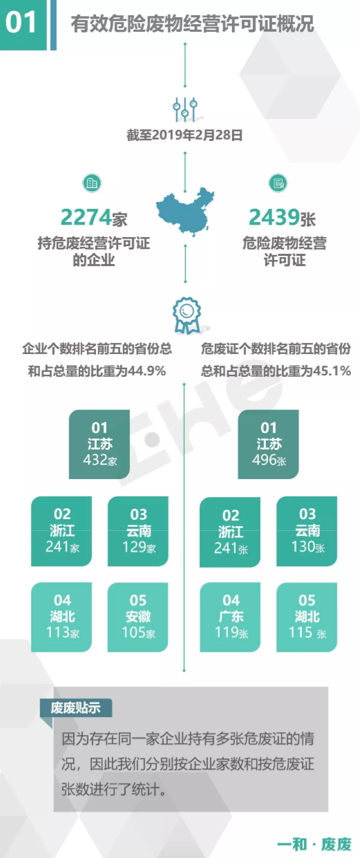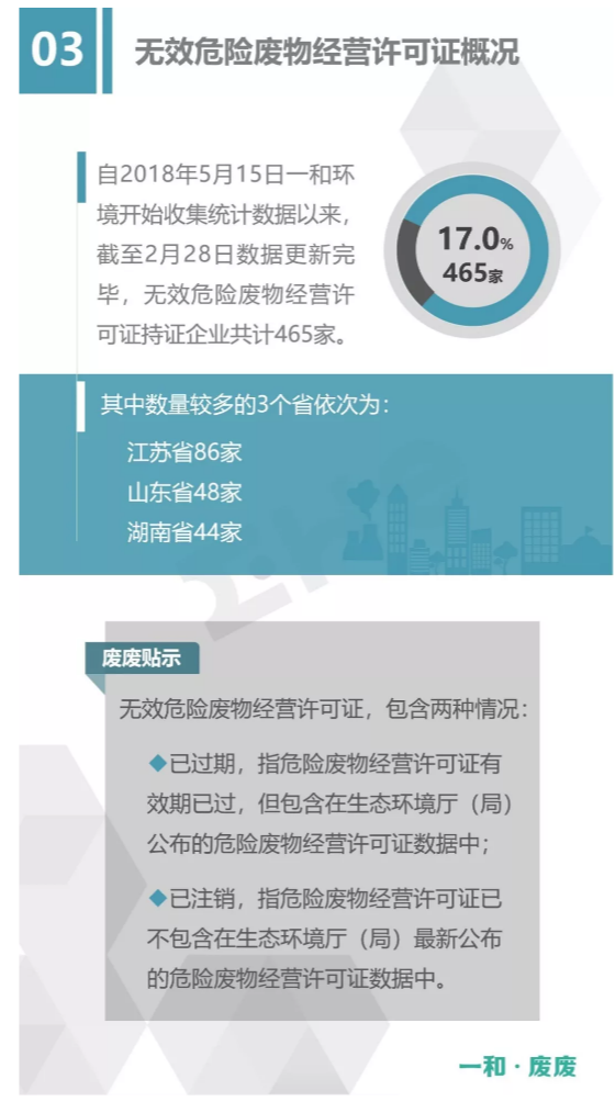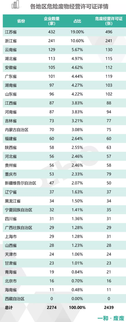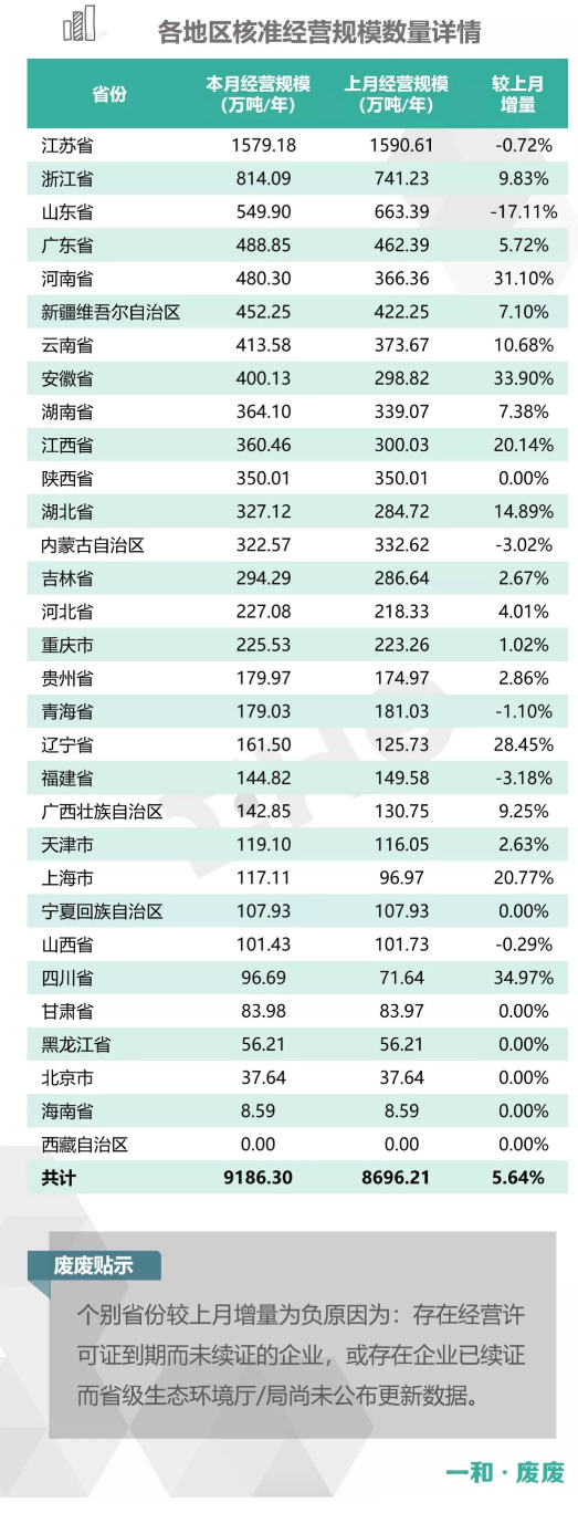 2.統(tǒng)計(jì)范圍:本次數(shù)據(jù)收集統(tǒng)計(jì)的范圍為省級生態(tài)環(huán)境廳(局)官方公布的持有危險(xiǎn)廢物經(jīng)營許可證企業(yè)的數(shù)據(jù),因此由地級市發(fā)布的醫(yī)療廢物經(jīng)營許可證、收集經(jīng)營許可證,且未納入省級生態(tài)環(huán)境廳(局)公布數(shù)據(jù)的部分,并未計(jì)入統(tǒng)計(jì)數(shù)據(jù)中。