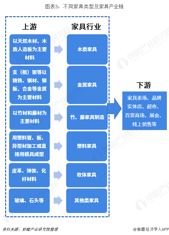 根據(jù)《國民經(jīng)濟(jì)產(chǎn)業(yè)分類》中,家具制造業(yè)是指用木材、金屬、塑料、竹、藤等材料制作的,具有坐臥、憑倚、儲藏、間隔等功能,可用于住宅、旅館、辦公室、學(xué)校、餐館、醫(yī)院、劇場、公園、船艦、飛機(jī)、機(jī)動車等任何場所的各種家具的制造。按照家具其主要使用材料進(jìn)行分類,包括木質(zhì)家具、金屬家具、竹藤家具、塑料家具及其他家具類型,其對應(yīng)的下游包括家具賣場、品牌實體店、超市、百貨商場、展會及線上銷售等。