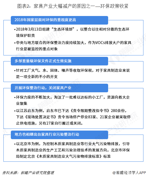 2018年家具產(chǎn)量大幅減產(chǎn)的原因之一是環(huán)保政策的陸續(xù)出臺。環(huán)保政策的收緊,國家及地區(qū)對木質(zhì)家具企業(yè)的污染問題、甲醛問題等陸續(xù)進(jìn)入進(jìn)入整治階段,中小家具企業(yè)陸續(xù)倒閉,家具行業(yè)數(shù)量減少,導(dǎo)致全國總產(chǎn)量減少。2018年國家層面對環(huán)保的重視度更高:2018年3月13日組建“生態(tài)環(huán)境部”,以整合以往相對分散的生態(tài)環(huán)境保護(hù)職責(zé);中央與地方聯(lián)合的環(huán)保整治力度持續(xù)加大,作為VOCs排放大戶的家具行業(yè)是被監(jiān)控的重點對象;多部重量級環(huán)保文件正式生效實施:針對大氣污染治理、水污染治理、固廢污染治理、噪聲污染治理等收取環(huán)保稅,對于家具制造業(yè)來說是一項全新的不小的開支。環(huán)保力度的不斷加大,淘汰了一批難以達(dá)標(biāo)的小工廠,資源向著大企業(yè)聚集;以江蘇啟東為例,啟東市已下達(dá)《責(zé)令限期整改指令書》280余份,下達(dá)《現(xiàn)場處置決定書》責(zé)令當(dāng)場停產(chǎn)停業(yè)83家、21家企業(yè)被企業(yè)被采取停止供電措施,另有27家自行搬遷或關(guān)閉……
