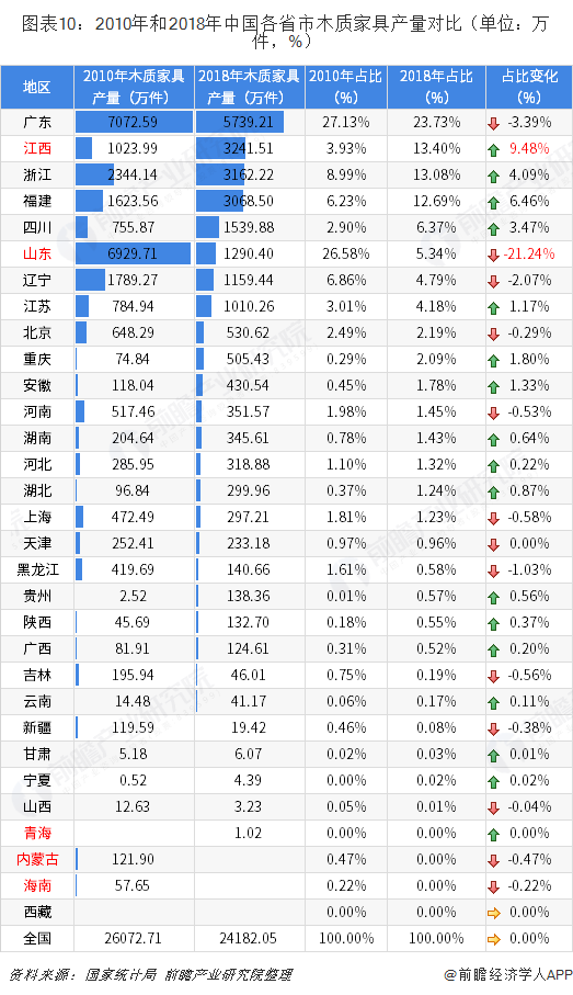 第二,與2010年相比,2018年全國木質(zhì)家具產(chǎn)量有所降低,但是大部分地區(qū)的產(chǎn)量有所增加,如江西、浙江、福建、四川等地區(qū);這主要是由于廣東和山東的木質(zhì)家具產(chǎn)量大幅下降,尤其是山東??;2010年山東和廣東的木質(zhì)家具產(chǎn)量份額均在27%上下,但是2018年山東省產(chǎn)量份額下降至5.34%。