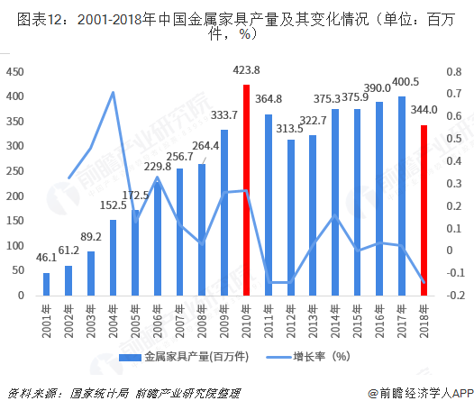 根據(jù)國家統(tǒng)計局統(tǒng)計,金屬家具的發(fā)展階段與家具行業(yè)整體發(fā)展歷程十分相似;2001-2010年處于行業(yè)增長期,2010年金屬家具產(chǎn)量達(dá)到423.8百萬件,達(dá)到歷史最高;2011-2018年行業(yè)處于調(diào)整期,產(chǎn)量漲跌幅度較大。2018年中國家具總產(chǎn)量下降94.26百萬件,僅金屬產(chǎn)量2018年就大幅減產(chǎn)56.51百萬輛,貢獻(xiàn)率高達(dá)60%。