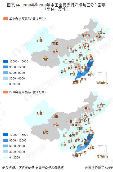 對比2010年和2018年各省市的金屬家具產(chǎn)量數(shù)據(jù)及分布圖示發(fā)現(xiàn)金屬家具產(chǎn)業(yè)遷移呈以下特點。