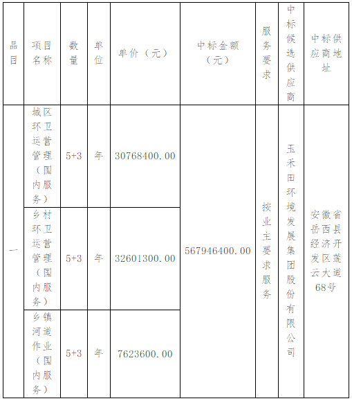 江西省尋烏縣城鄉(xiāng)環(huán)衛(wèi)全域一體化項目發(fā)布中標(biāo)結(jié)果公告,玉禾田環(huán)境發(fā)展集團(tuán)股份有限公司成為中標(biāo)的社會資本方,中標(biāo)金額為5.68億。