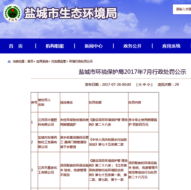 最近的一次是2018年7月18日,因逃避監(jiān)管方式排放污染物,被鹽城市環(huán)境保護(hù)局責(zé)令改正違法行為,并處罰款人民幣20萬(wàn)元。