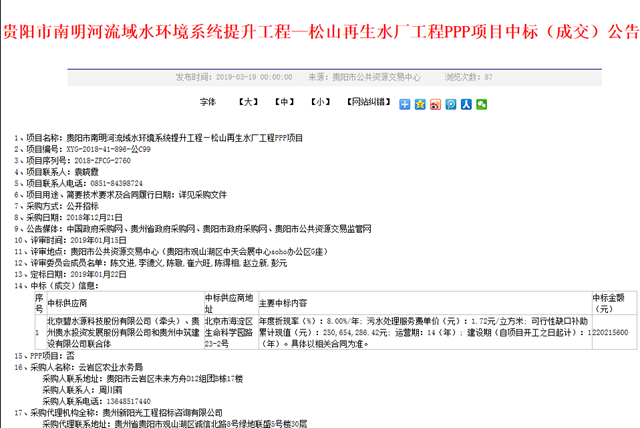北京碧水源科技股份有限公司(牽頭)、貴州貴水投資發(fā)展股份有限公司和貴州中筑建設有限公司聯(lián)合體中標貴陽市南明河流域水環(huán)境系統(tǒng)提升工程—松山再生水廠工程PPP項目,中標金額為22021.56萬元。