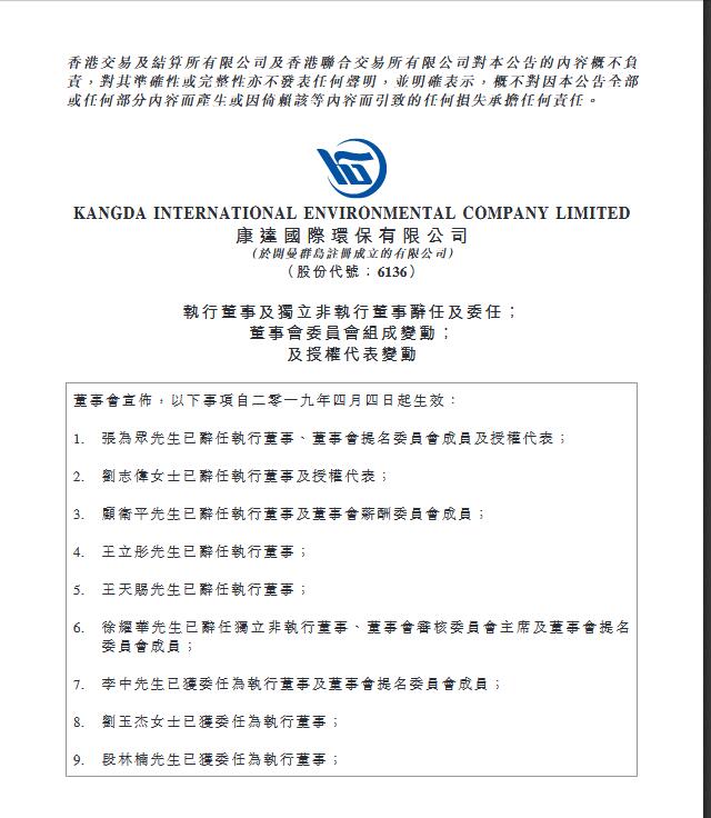 康達(dá)環(huán)保發(fā)布公告,張為眾已辭任執(zhí)行董事、董事會(huì)提名委員會(huì)成員及授權(quán)代表;劉志偉已辭任執(zhí)行董事及授權(quán)代表;顧衛(wèi)平已辭任執(zhí)行董事及董事會(huì)薪酬委員會(huì)成員;王立彤已辭任執(zhí)行董事;王天賜已辭任執(zhí)行董事;徐耀華已辭任獨(dú)立非執(zhí)行董事、董事會(huì)審核委員會(huì)主席及董事會(huì)提名委員會(huì)成員。