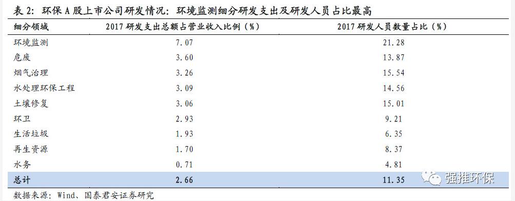 研發(fā)支出:研發(fā)支出收入占比、研發(fā)人員占比高。參考A股環(huán)保上市公司2017年平均研發(fā)支出總額占營(yíng)業(yè)收入比例2.66%,研發(fā)人員數(shù)量占比11.35%,其中環(huán)境監(jiān)測(cè)細(xì)分研發(fā)支出及研發(fā)人員占比最高。