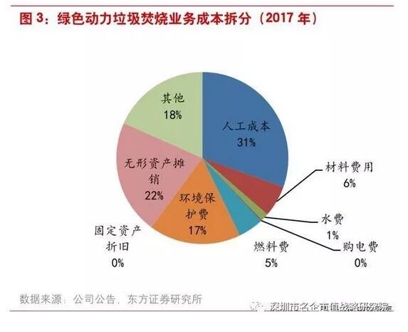 決定垃圾焚燒運(yùn)營(yíng)成本的主要因素包括:項(xiàng)目初始投資(決定折舊及攤銷),負(fù)債率及平均利率(決 定財(cái)務(wù)費(fèi)用),環(huán)保排放標(biāo)準(zhǔn)(決定環(huán)境保護(hù)費(fèi)、材料費(fèi)等),根據(jù)部分公司披露的項(xiàng)目運(yùn)營(yíng)成本 分析,綠色動(dòng)力垃圾焚燒業(yè)務(wù)的主要成本構(gòu)成為:人工成本(31%)、無形資產(chǎn)攤銷(22%)、環(huán) 境保護(hù)費(fèi)(17%)等。中國(guó)天楹的主要成本構(gòu)成為:折舊及攤銷(37%)、原材料(24%)、人工(20%)。無形資產(chǎn)攤銷主要來自于垃圾焚燒項(xiàng)目投資,一般采取直線法進(jìn)行攤銷。其他運(yùn)營(yíng)成本 包括檢修支出及檢測(cè)費(fèi)用等。