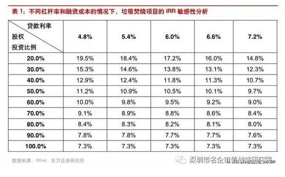 不同的股權(quán)投資比例和融資成本會(huì)顯著影響項(xiàng)目的收益率,當(dāng)融資寬松時(shí),融資比例上升,融資成 本下降,項(xiàng)目收益率上升;而在 2018 年去杠桿的背景下,項(xiàng)目的收益率也受到杠桿率下降和融資 成本上升的影響,但由于垃圾焚燒項(xiàng)目進(jìn)入運(yùn)營(yíng)期后擁有穩(wěn)定的現(xiàn)金流,屬銀行等金融機(jī)構(gòu)優(yōu)先支 持項(xiàng)目,不存在融資難的問題。
