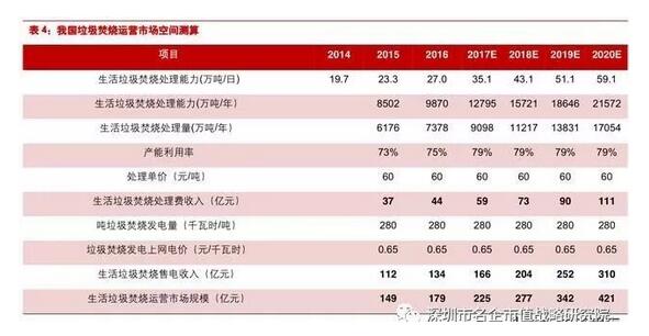 生活垃圾焚燒比例不斷提升;截至 2015 年,焚燒發(fā)電占我國(guó)生活垃圾處理總產(chǎn)能的比重為 31%,離“十三五規(guī)劃”的 2020 年達(dá)到 54%還有一定差距?!笆逡?guī)劃”中提到至 2020 年我國(guó)垃圾焚燒處理能力達(dá)到 59.10 萬噸/日,我們假設(shè)處理能力每年增量相同,則 2017-2020 年每年需要增加 8.02 萬噸/日的垃圾焚燒處理能力,2018-2020 年均復(fù)合增速將達(dá)到 17.1%。根據(jù)我們的預(yù)測(cè),至 2020 年我國(guó)生活垃圾焚燒運(yùn)營(yíng)市場(chǎng)將達(dá)到 400 億元/年。