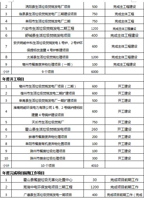 (二)年內(nèi)完成主體工程建設(shè)項目。完成利辛縣、渦陽縣、舒城縣、太湖縣生活垃圾焚燒發(fā)電項目,臨泉縣、阜陽市、六安市生活垃圾焚燒發(fā)電項目二期,以及安慶皖能中科生活垃圾焚燒發(fā)電提標改造暨新建項目、亳州市餐廚廢棄物處理項目等9個項目主體工程建設(shè)任務(wù)。