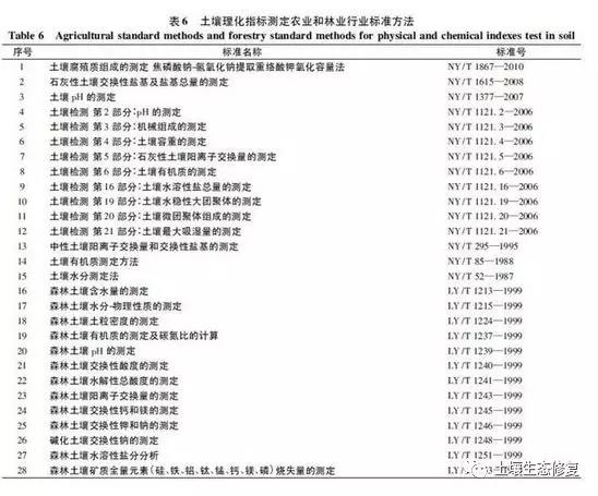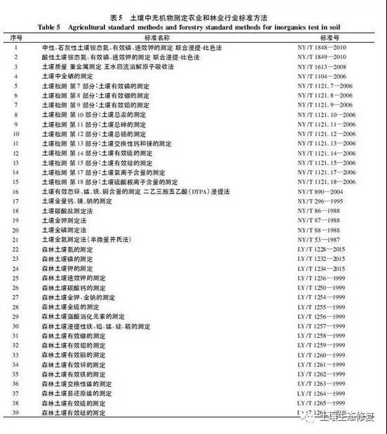 8個(gè)理化指標(biāo)等方法中,涉及5個(gè)測定指標(biāo)(電導(dǎo)率、氧化還原電位、有機(jī)碳、可交換酸度、干物質(zhì)和水分等),以及5種測定方法(電極法、滴定法、重量法、分光光度法和非分散紅外法等)。另外,農(nóng)業(yè)、林業(yè)也有土壤檢測標(biāo)準(zhǔn)方法,主要側(cè)重于土壤營養(yǎng)元素及其有效態(tài)、理化指標(biāo)的檢測,詳見表5和表6。農(nóng)業(yè)行業(yè)標(biāo)準(zhǔn)方法中,有21個(gè)涉及無機(jī)元素及其有效態(tài)測定的方法,有15個(gè)涉及土壤理化指標(biāo)的方法;林業(yè)行業(yè)標(biāo)準(zhǔn)方法針對的是森林土壤,有15個(gè)涉及無機(jī)元素及其有效態(tài)測定的方法,有13個(gè)涉及土壤理化指標(biāo)的方法。