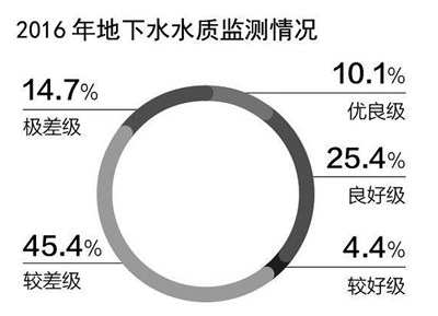 以地下水含水系統(tǒng)為單元,潛水為主的淺層地下水和承壓水為主的中深層地下水為對(duì)象的6124個(gè)地下水水質(zhì)監(jiān)測(cè)點(diǎn)中,水質(zhì)為優(yōu)良級(jí)、良好級(jí)、較好級(jí)、較差級(jí)和極差級(jí)的監(jiān)測(cè)點(diǎn)分別占10.1%、25.4%、4.4%、45.4%和14.7%。