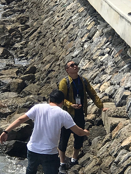 生態(tài)環(huán)境部派出的排查人員在大連市金普新區(qū)排查現(xiàn)場(chǎng)。郄建榮 攝