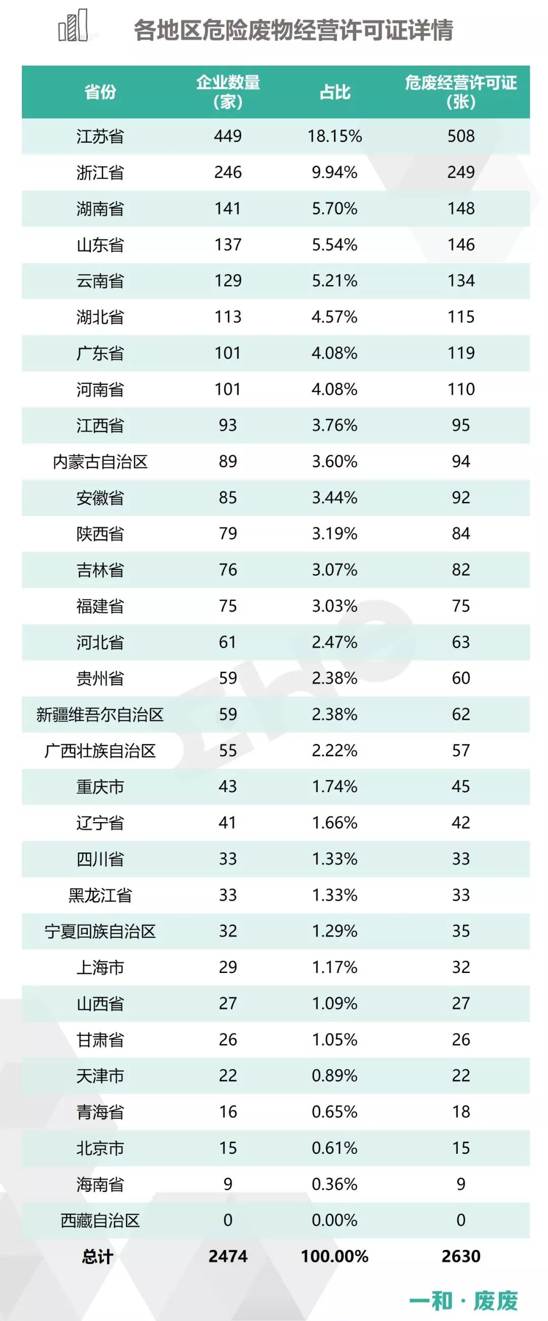 一和環(huán)境發(fā)布2019年6月危險(xiǎn)廢物經(jīng)營許可證統(tǒng)計(jì)情況,截止6月30日,共計(jì)發(fā)放2630張危廢經(jīng)營許可證,詳情如下: