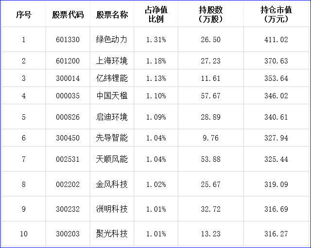 該基金的10大重倉(cāng)持股包括綠色動(dòng)力、上海環(huán)境、啟迪環(huán)境、中國(guó)天楹、聚光科技等行業(yè)龍頭,凈值占比、持股數(shù)量以及持倉(cāng)市值,見下表: